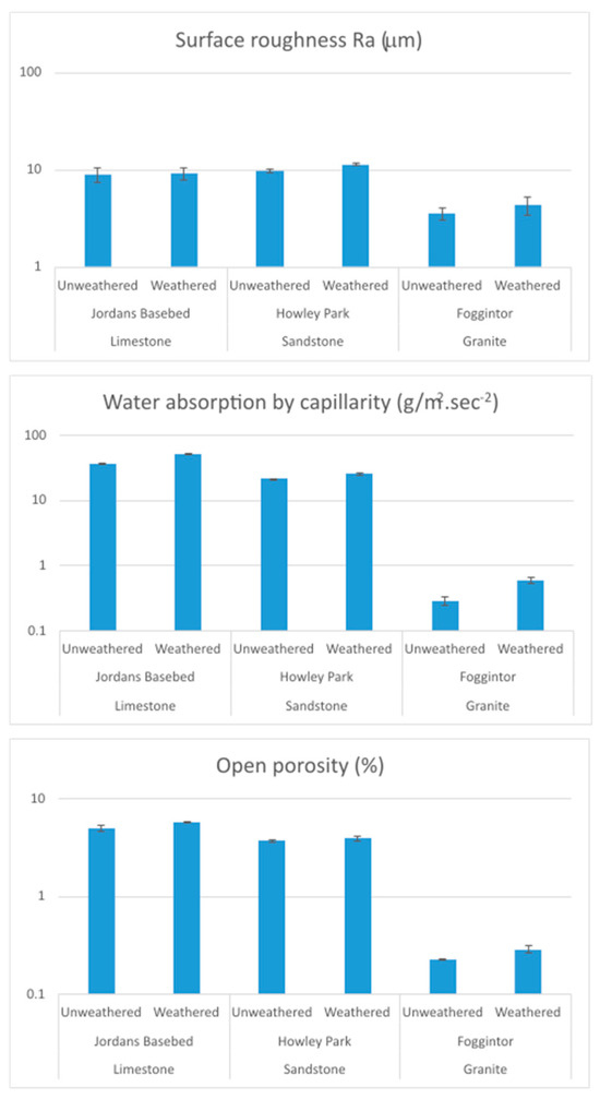 Primary bioreceptivity is measured using new, sound stone, and secondary bioreceptivity measurements are obtained using artificially weathered stone. Physical characteristics for the three stone types were measured pre- and post-artificial weathering in order to examine their relationship to factors influencing biodeterioration and characterise changes in properties after artificial weathering. Water absorption by capillarity and open porosity for unweathered Portland Jordans Basebed limestone fell within the expected range provided by the technical data sheets [62]. No prior technical testing data were available for Howley Park sandstone or Foggintor granite.