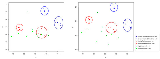 Comparison between L*a*b* colour readings for wet and dry stones prior to artificial weathering. Limestone (red) and sandstone (blue) show separate clusters (circled) of the wet (lighter red and blue) and dry (darker red and blue) readings together, whereas granite (green) demonstrates overlapping colour measurements.