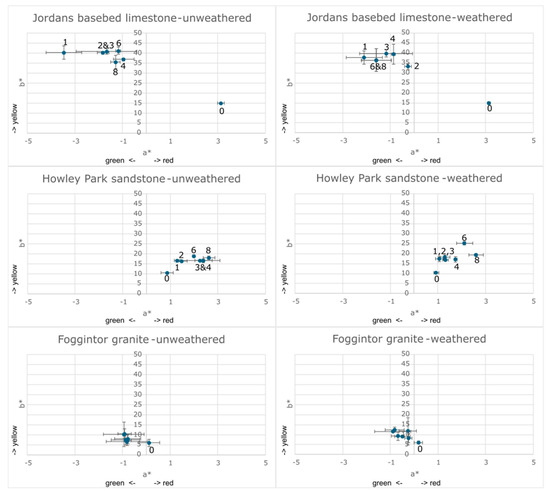 Comparison of a* and b* colour readings for inoculated stone over weeks 0–8. Week 0 shows the average a* and b* of the saturated non-inoculated stone. With the exception of Foggintor granite, for which the data points are too highly clustered and all fall within each other’s error bars, the data points are annotated by the week they represent. Error bars are standard deviation.