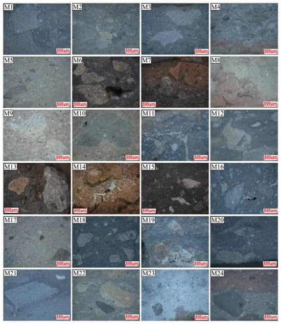 In the microscopic analysis of the samples, a Zeiss Imager.a1M microscope with a built-in AXIOCAM camera was used, using AxionVisionRelease 4.7.1 software produced by Zeiss, Oberkochen, Germany. The samples were sanded with a Struers LaboPol device (Struers, Copenhagen, Denmark) using discs with different abrasion sizes. The mineralogical analysis was performed using cross-polarized and parallel-polarized nicoli.