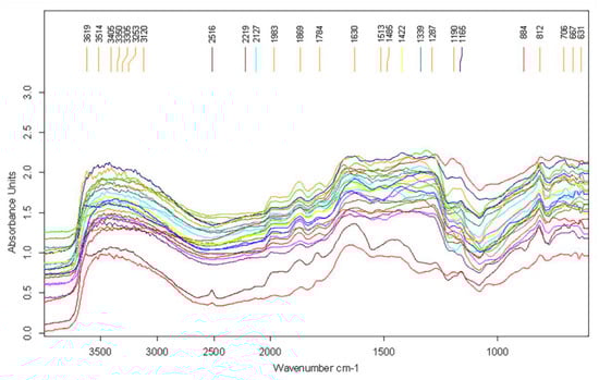 In all the analyzed samples, kaolinite (Al2Si2O5(OH)4) was identified through the peaks in the region of 3500–3750 cm−1 [,,,]. The absence of the peak at ~3700 cm−1 and the absence of the doublets at 915 cm−1 indicate that the vessels were fired at temperatures exceeding 500–550 °C [,,,,,].
