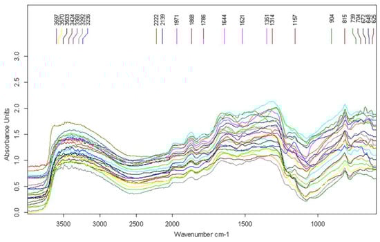 In the group pottery fragments from Costișa, in the water domain, which is located between 4000 and 3000 cm−1, peaks attributed to hydroxyl groups (OH) are visible between 3405 and 3120 cm−1, and OH deformations are visible at 1513 cm−1 and 1630 cm−1. These are due to water absorbed in the ceramic samples following depositional processes or as a result of cleaning the ceramic fragments [,,,,,,].