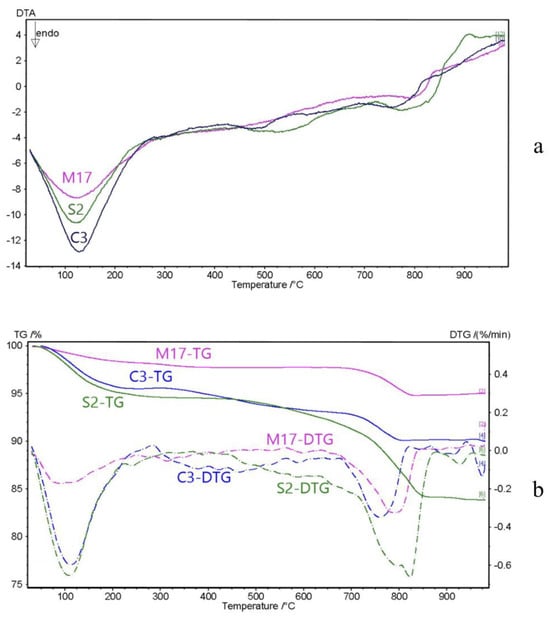 DTA (a) and TG/DTG (b) curves for samples C3, M17, and source S2.