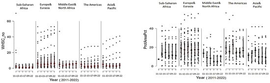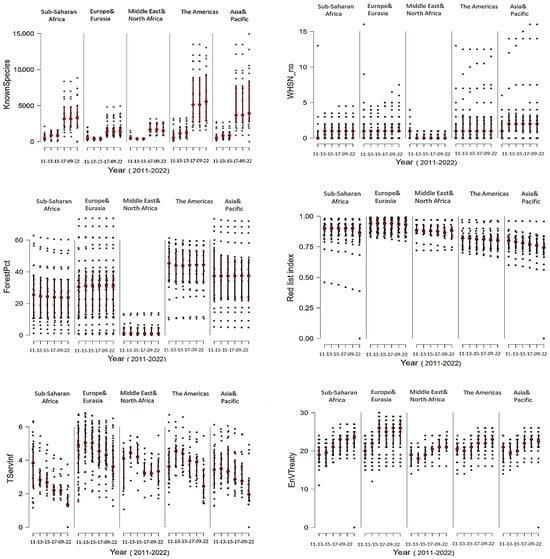 Table 2 presents the descriptive statistics of the analysed variables in our database of 2011–2013–2015–2017–2019–2022, for 117 countries, together with regional mean values. The normality testing of the variables rejected the assumption of normality; therefore, we used nonparametric statistical methods that are not sensitive to lack of normalities. The variables were compared for significant differences between regions and years, applying the Kruskal–Wallis nonparametric test. Table 2 shows that significant differences were found between regions for all variables, while, regarding the years, only the ProtAreaPct, KnownSpecies, TServInf, and EnvTreaty variables differed significantly. Figure 1 presents the temporal patterns of each variable by region.