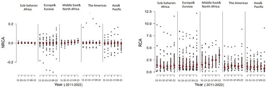 The application of NRCA for trade analysis is justified by its ability to handle the weaknesses of RCA, as is explained in the Materials and Methods section. As was stated in [], NRCA has the unique ability to be additive with respect to both countries and commodities, and it is consistent with regard to time. This feature makes NRCA values comparable between countries, commodities, and time periods.