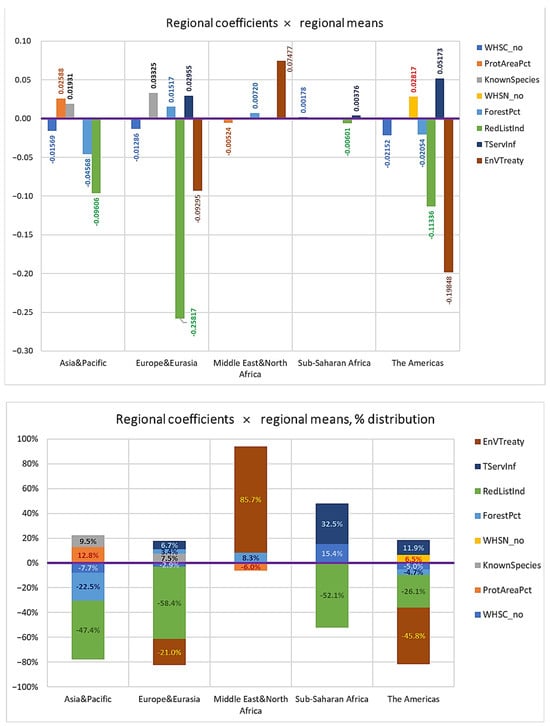 The impact of the Red List Index seems to be the largest, representing approximately 58% of the impacts in Europe and Eurasia, 52% in Sub-Saharan Africa, 47% in Asia and Pacific, and 26% in the Americas, and these impacts are all negative. The single largest positive impact is seen in Middle East and North Africa, where the number of environmental treaties take up 86% of all impacts (with a positive sign), while this factor has a considerable importance in the Americas (−46%) and in Europe (−21%). The tourism infrastructure is rather influential in Sub-Saharan Africa (+ 33%), while its influence is much less in the Americas (+12%) and in Europe and Eurasia (+7%). The forest areas have a 23% influence, and the protected areas a 13% influence in the Asia and Pacific region, while the number of cultural world heritage sites show a 15% positive influence in Sub-Saharan Africa. The rest of the factors—natural world heritage sites, known species, and protected areas—play a much smaller role, with only 0% to 13% importance.