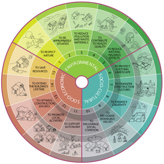 The classification system used in the Heritage for People Platform is based on the sustainability lessons from vernacular architecture that resulted from the previous VerSus project [3]. The VerSus methodology embraces a comprehensive, cross-cutting approach to sustainability. It categorises sustainability lessons into three levels—environmental, socio-cultural, and socio-economic—each with five guiding principles and an accompanying list of case-based strategies for each principle (Figure 1). The definition of the 15 principles and their related strategies is the result of extensive research initiated through the observation of vernacular architectures. The principles and strategies concerning the environmental aspect of sustainability encompass the integration of habitats with the natural and climatic features of a place. This includes employing natural and climatic resources effectively while minimising pollution, resource consumption, and waste generation. Socio-economic sustainability principles and strategies refer to the ability to generate and maintain income and social welfare within the territory, supporting self-reliance, promoting local activities and saving resources. The list of strategies, as presented in Table 1, is not static; rather, it can be increased and adjusted based on the preferences and input of the users who will utilise the platform.
