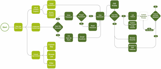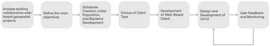 The methodological approach to the platform’s development is depicted in Figure 2. It began with a comprehensive analysis of the context and key concepts that shaped the project’s core challenges and overall objectives. Existing digital tools for managing vernacular knowledge and Figurecultural heritage based on geographically located resources were examined, focusing on their classification systems, advanced search features, collaborative data input, and user engagement strategies.