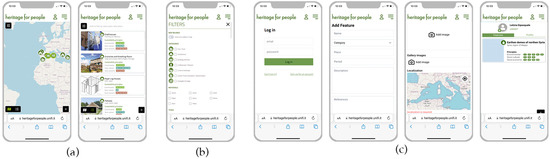 As a consultation tool, the Heritage for People Platform allows users to explore content via an interactive map or browse through a comprehensive list (Figure 4a). Users can filter features by categories, types of intervention, materials, and strategies related to the 15 sustainability principles (Figure 4b). This functionality ensures that users can efficiently access the information most relevant to their needs and interests. As a collaboration tool, the platform enables logged-in users to contribute new features, create hyperlinks to external references, and highlight their favourite content (Figure 4c). Users can propose new environmental, socio-cultural, or socio-economic strategies and suggest different materials not included in the provided list. This collaborative aspect ensures that the platform remains a dynamic and evolving resource, enriched by the contributions of its user community.