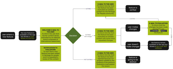 To maintain the app’s open nature while ensuring the quality and appropriateness of uploaded content, the development team prioritised the integration of a content moderation system. This system is designed to uphold the integrity of the information shared on the platform by preventing the inclusion of irrelevant, inappropriate, or inaccurate content. The moderation process is overseen by an editorial board composed of international researchers with expertise in vernacular and sustainable architecture, primarily drawn from the VerSus+ project partners. Moderators receive notifications whenever a new feature is submitted and can choose to validate, reject, or request revisions from the user (Figure 5). Throughout this moderation process, the content remains visible to other users, marked as “being accepted”, ensuring transparency and allowing for community feedback.