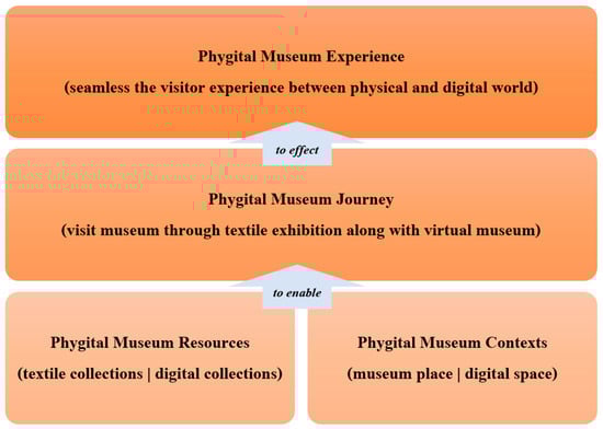 The phygital context includes the spaces where the phygital transformation occurs, encompassing both the physical museum site and any digital platforms or virtual environments. This context combines the physical museum setting, where textile collections are exhibited, with digital spaces that might include online galleries, interactive websites, or virtual reality experiences. The context’s role in the framework is to provide the setting that integrates these resources in a way that supports seamless interactions between physical and digital realms. This context is essential to making the experience accessible and engaging for a broader audience, including those who may only interact virtually.