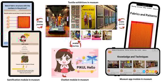 For on-site visitors, visitors to the museum are offered a seamless blend of physical and digital interactions. At the museum, they can physically engage with textile artifacts while simultaneously accessing detailed information and multimedia content through the mobile application. For instance, the physical exhibits include labels with QR codes, allowing visitors to dive deeper into the historical and cultural context of the artifacts via digital platforms. The chatbot is also accessible on-site, answering visitors’ queries and enhancing their understanding of the displays. For those unable to visit the museum, the digital platform provides alternative engagement opportunities. Visitors can explore virtual exhibitions through the website and the mobile app, which feature virtual tours, videos, and interactive games designed to educate and entertain [,]. This ensures that individuals who cannot physically visit the museum still have a meaningful way to experience its collections. These features are accessible via the museum’s digital tools and help bridge the educational gap between physical and digital realms.