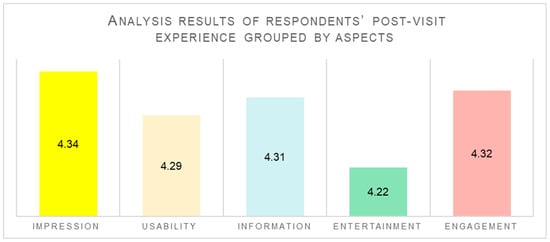 As seen in Table 2, participants were asked to rate their post-visit experience on a 5-point scale. The second section of the questionnaire focused on evaluating how participants experienced use of the platform during their visit. Based on [,,], this questionnaire included sections on impression (Q1–Q3), usability (Q4–Q6), information (Q7–Q11), entertainment (Q12–Q14), and engagement (Q15–Q18).