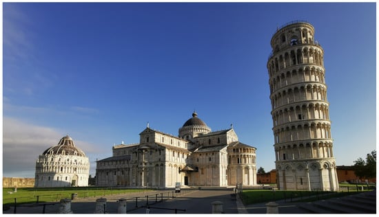 Piazza del Duomo in Pisa, or Square of Miracles, is one of the most famous architectural complexes in the world. It features four main religious buildings: the Cathedral of Santa Maria Assunta, the Baptistery of San Giovanni, the Camposanto Monumentale (monumental cemetery), and the Cathedral’s bell tower, the iconic Leaning Tower. Each structure contributes to the square’s grandeur and historical significance [27,28], earning it UNESCO World Heritage status on 26 February 1987.