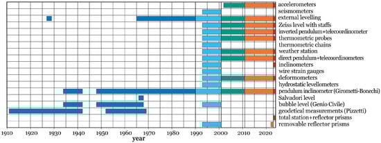 Figure 2 summarizes all monitoring systems of the tower. The SHM system, which has evolved over time, can be schematically divided into five main configurations. The first phase corresponds to the historical measurements carried out on the tower since 1911. The second phase (1990–2001) coincides with the structural strengthening and geotechnical stabilization. The third phase (2001–2011) starts with the reopening of the tower to the public after its stabilization. The fourth phase (2011–2023) involves changes in the configuration, and finally, the fifth phase corresponds to the period from 2023 onwards, with the monitoring system enhanced with new instruments.