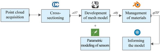 The primary goal of the IM is to support the exploration of the SHM system of the monuments of the square by providing a comprehensive view of sensors and device positions over time (accounting for some approximation since the model can deviate up to 10 cm from the actual geometry). Figure 3 summarizes the methodology used to develop the IM of the asset.