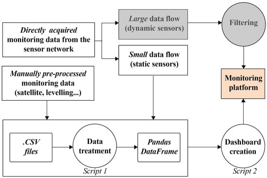 The interactive, web-based monitoring platform comprises sensor data of the monuments in the square. It accounts for various sources, including measurements accumulated over many years. Figure 4 illustrates the main actions required to create the platform. Data types are represented with rectangles in the graph, while circles enclose scripts.