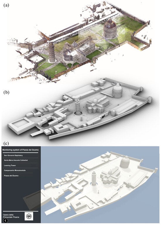 The IM of Piazza del Duomo, as detailed in Section 3, was developed starting from a point cloud acquisition (Figure 5a), which served as the basis for the mesh modeling of each monument (Figure 5b), created using Rhinoceros and the Grasshopper plugin. Then, in Blender, white and transparent textures were applied to the whole square to help the visualization of sensors localized outside and inside the single monuments, respectively. Finally, a web-based interface was created using 3DVVT to allow the interactive exploration of the model, which was enriched within the same software with information on the past and present SHM systems of the square and individual monuments (Figure 5c). Figure 6 illustrates the individual IMs and the corresponding SHM systems.