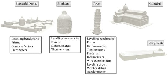 The tower is the square’s most monitored building, followed closely by the Baptistery. The latter is fitted with eight external leveling benchmarks along its perimeter and 24 more inside, together with about 50 reflective prisms placed at three different heights to evaluate 3D displacements. In addition, eight displacement sensors equipped with a thermometer were operational between 2014 and 2016 to monitor cracks located on the intrados of some vaults (they were then removed, as vaults were deemed to be safe [39]).