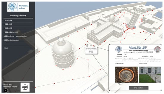 The interactive visualization tools presented here stem directly from the needs of Opera Primaziale Pisana, the organization responsible for safeguarding and promoting Piazza del Duomo in Pisa. The monitoring system for the Leaning Tower and the whole square has undergone continuous evolution, incorporating numerous devices over the years, which have been replaced, relocated, or removed as required. Recently, the Technical Office of the Opera Primaziale Pisana requested a comprehensive 3D map documenting all the instruments installed throughout the monumental complex over the past century, including their operational periods, while emphasizing the need for a web-based tool to visualize SHM data corresponding to specific time periods. This request aligns with the requirements of the Surveillance Group of the Leaning Tower of Pisa, a multidisciplinary team tasked with ensuring the safety of the tower.