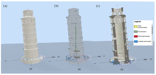 Figure 8 introduces the tower’s model and visualization options available for each monument using white or transparent textures. The white version in Figure 8a can be selected to clearly highlight the geometry of the structures and the external instruments, while the transparent material in Figure 8b reveals internal sensors. To further enhance usability of the IM, a slicing option displays the east or west half cross-section (Figure 8c). Each visualization mode includes a legend for instrument identification, and cardinal directions are annotated on each monument model for orientation, particularly useful for the axially symmetrical Baptistery and tower.