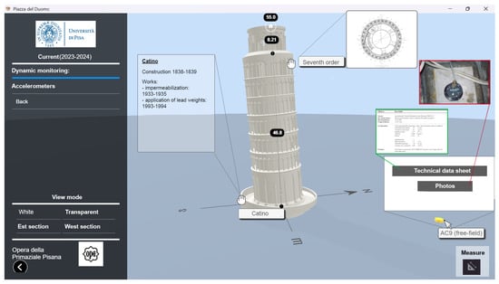 Figure 9 illustrates some of the features mentioned above: clicking on the Catino allows users to view information about its history; clicking on the free-field accelerometer gives access to its technical and photographic documentation; clicking on the seventh order displays the plan of that level; and using the measurement tool, in this case, provides information about the height of the various tower’s orders.