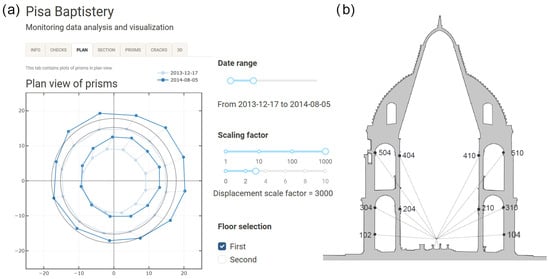 (a) PLAN tab of Baptistery page. Users can view first- and second-floor prism displacements between two dates through an interactive plot where scale factor can be chosen as needed. (b) section of the Baptistery showing the positions of prisms measured with a total station from the center of the monument.