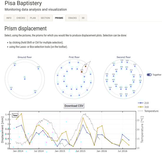 Each dashboard page is organized into tabs for specific purposes. For instance, the page dedicated to the Baptistery is divided into seven tabs. The INFO tab provides a Gantt chart of data availability and sensor technical details. The CHECKS tab compares displacement measurements from optical leveling and prisms (acquired via a total station) alongside temperature data. The PLAN, SECTION, PRISMS, and 3D tabs all employ displacement data from prisms installed on column capitals at different levels of the Baptistery (Figure 10b): in the PLAN (Figure 10a) and SECTION tabs, users can view prism displacements between two selected dates, respectively, on horizontal or vertical sections, to gain valuable insights into the monument’s deformations at different times, while the PRISM tab displays the displacement of selected prisms over time, decomposed into radial, tangential, and vertical components, as well as the total displacement, and compares them with temperature trends (Figure 11). The 3D tab shows prism displacements between two chosen dates, similar to the PLAN and SECTION tabs, but with a 3D visualization. Lastly, the CRACKS tab shows the progression of crack widths in the Baptistery vaults, monitored via displacement sensors and thermometers. This tab includes a downsampling feature for hourly data, using piecewise linear interpolation and rolling window averaging to address gaps in data collection.