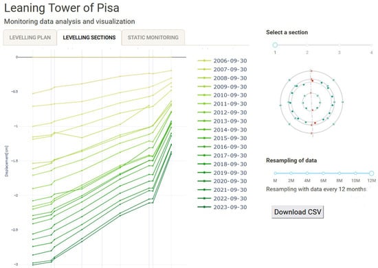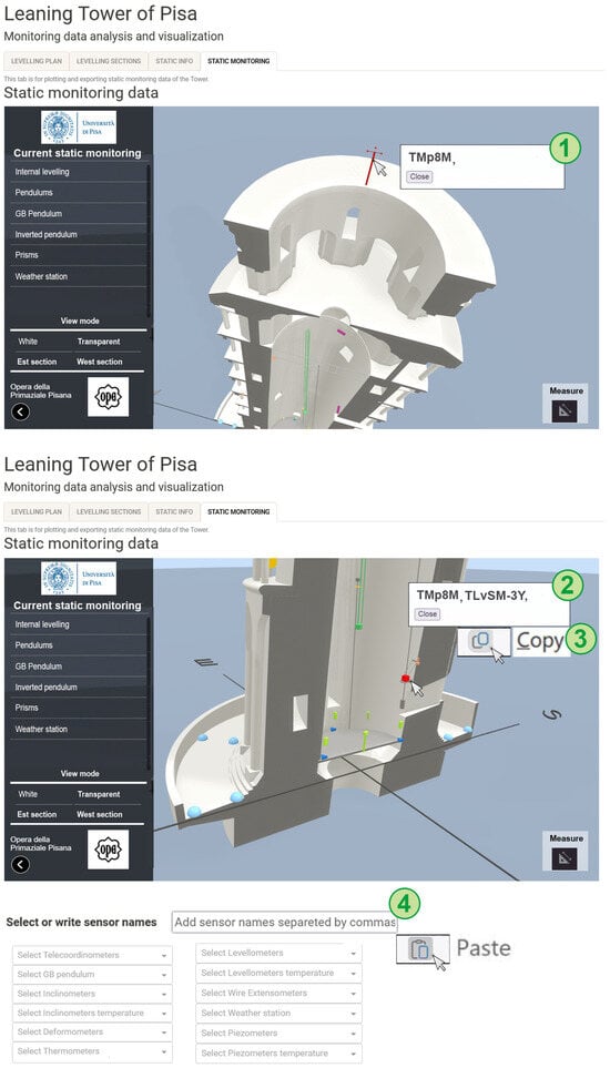 Moreover, the side menu of each monument lets users select a specific period and view the sensors active during that time. For certain monitoring phases of the tower (see Section 2.2), users can also explore details of the static or dynamic monitoring systems. Instruments can be toggled on or off via the menu, simplifying views when many are present.