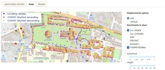 PLAN tab of Piazza del Duomo’s page. It is possible to select the leveling network or satellite scatterers (LOS or vertical dataset) and filter them by height and coherence values. By selecting specific points, their displacements over time will be displayed below.