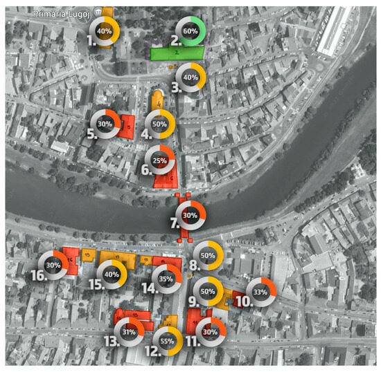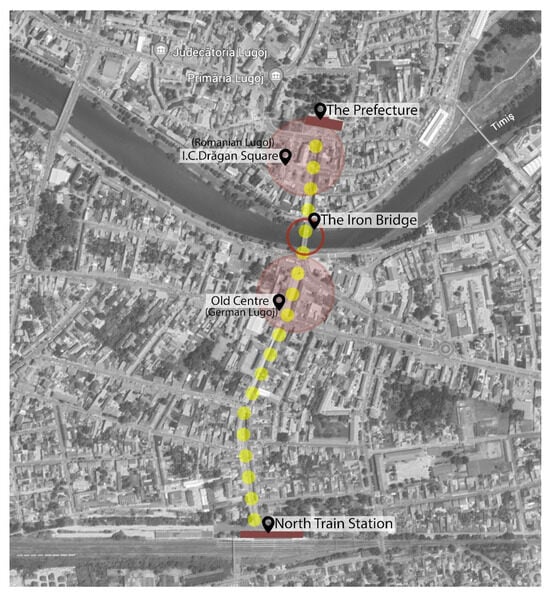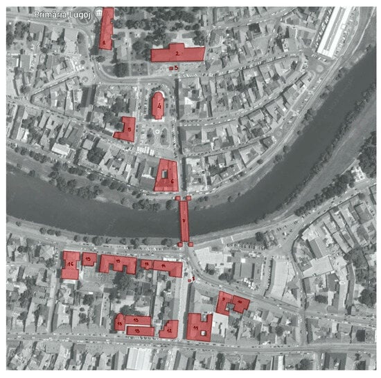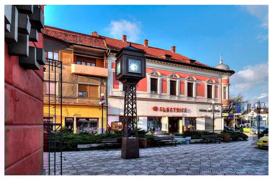 The importance of public spaces, especially the central ones within a city, was studied in multiple research areas, showing the fact that people are more prone to enjoy walking through a space that presents a lot of scenery and various details, rather than a simple, plain space [,]. This aspect highlights the importance of public space architecture []. Nowadays, most developed countries have succeeded in preserving the value and identity of local communities by preserving the historical areas and buildings, not only through restoration using innovative materials [] but also by maintaining a vibrant atmosphere around these heritage assets []. Moreover, the heritage assets and public spaces represent an important element in the daily life of people because of their social and cultural implications, which are the core of the Lugoj’s identity [].