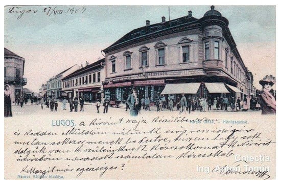 Old postcard of the centre of German Lugoj, near the Iron Bridge, before the installation of the Electric Watch. The subject of this postcard is the Vertes Palace and, on the left corner, a small portion of the “Peta-Puscariu” House can be seen, known today as Pro Art Gallery [].