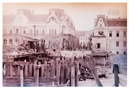 The Iron Bridge was a highly anticipated project for the people of Lugoj, which became a reality in 1902, thanks to the contribution of the local municipality to the city’s urbanisation process. The introduction of the Iron Bridge into the city’s architecture also required several modifications to organise the area: the widening of the old Bridge Street—now Unirii Street—and the flanking of it with two monumental palaces, Bejan (1901–1902) and Haberehrn (1899–1900). The municipality proposed the construction of the Iron Bridge starting in 1887, but this was not possible until July 1901 due to economic reasons [] (Figure 6).