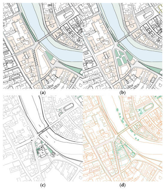 (a) Town’s plan from 1934; (b) town’s plan from 1950; (c) town’s plan from 2023; (d) overlap of all three plans; all plans are reconstructed based on historical photographs and on-site measurements [].