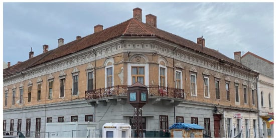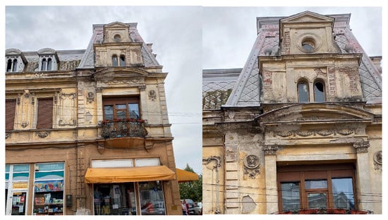 It is not uncommon for balconies and chamfered corners to be present in most historical buildings along with bay windows (Figure 11, Figure 12 and Figure 13). This was a common practice during the development of Lugoj.