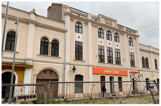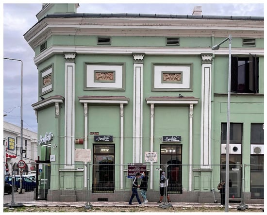 The old theatre that stands on the corner, across from the Dacia Hotel, was first mentioned in documents in 1733; however, now it no longer represents the old appearance of the building. First, the building was built as a coffee shop and restaurant with social games. During 1835, in the courtyard, the first theatre in Lugoj was built. In 1866, the new owner built the building as it is known today, but its first floor was not built until 1900, right before the introduction of electricity. The building is a classical architecture having Corinthian columns and, between the columns, there are imitations of metopes decorated with griffins, and the interior is heavily decorated (Figure 9) [].