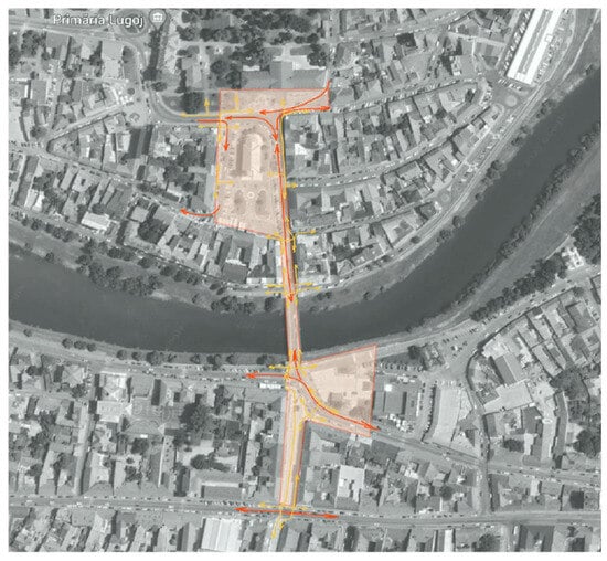 The Romanian side is known to be the oldest part of the town, and this theory can be sustained by the organic development of the area. The streets have no clear configuration, they are relatively narrow, and they focus on different points of interest in the town, for example, the farmers’ market and the church plaza (Figure 4) [].