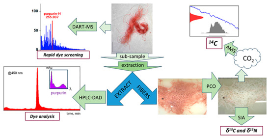 The most efficient approach to the analysis of the textiles is one that utilizes a single sample to obtain all of the desired information. As accelerator mass spectrometry requires only small amounts of carbon for dating, it has made the dating of single yarns not just possible, but routine. Dye analysis, too, can be completed on small samples without any sample preparation [85,86,87] or on low volumes of extracts from minute samples [88,89,90,91,92]. Combining sequential analysis and dating is not new. Smith et al. [93] combined HPLC-MS/MS with combustion and AMS sequentially to identify dyes and directly date yarns from a Nazca textile to determine its authenticity. Sequentially applying DART-MS and PCO, as reported by Armitage and Jakes [94], has both benefits and drawbacks: DART-MS is best for dye screening, rather than comprehensive characterization, while PCO can be performed so the yarn is not consumed in the process of making CO2 for AMS dating.