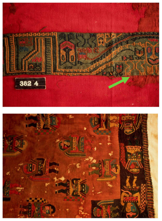 Two of the mantles from WK12/382. Top, 382-4, Linear Style with embroidered border and degraded red-brown ground cloth (arrow). Bottom, 382-7, Block-Color Style with embroidered border and reddish beige ground cloth, described as “salmon” on unwrapping in 1929. Photos by Anne Paul, Anne Paul Paracas textile archive, Dumbarton Oaks, Trustees for Harvard University, Washington, DC. Additional photos provided in Supplementary Materials.