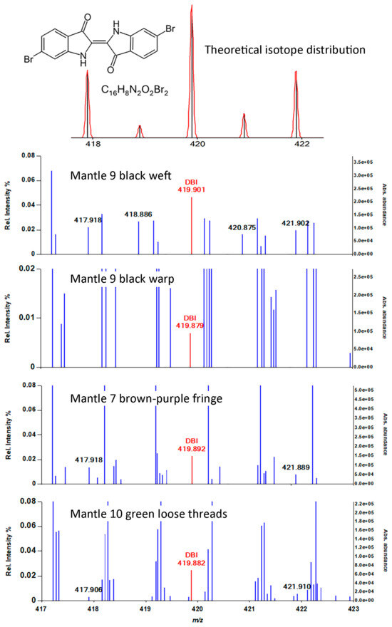 DART-MS spectra showing major isotope peaks for the M− ions of dibromoindigo.