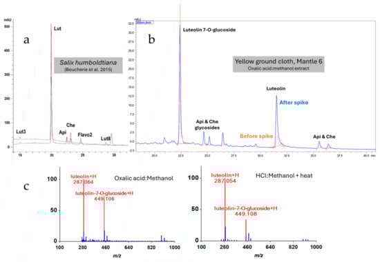 - Zhang, X.; Boytner, R.; Cabrera, J.L.; Laursen, R. Identification of Yellow Dye Types in Pre-Columbian Andean Textiles. Anal. Chem. 2007, 79, 1575–1582. [Google Scholar] [CrossRef]