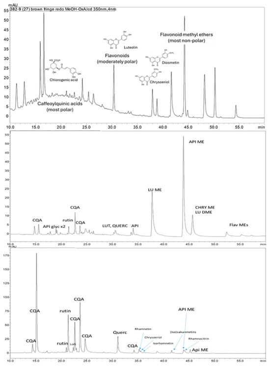 | Green | Border fringe | Indirubin | Indigotin, indirubin | 350 nm: Luteolin 7-O-glucoside, luteolin, apigenin, genkwanin (apigenin methyl ether), luteolin methyl ether, other flavonoid glycosides and methyl ethers, cafeoylquinic acid, indirubin | |