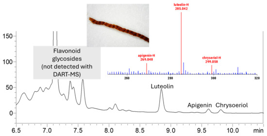 Based on the DART-MS screening, specific compounds were targeted for extraction with the alternative preparations (DMSO and HCl–methanol) for HPLC-DAD analysis. The spectra also suggested what compounds to specifically look for in the chromatograms, keeping in mind that the results from the yarns directly and those obtained on extracts will likely be different based on the solubility of the compounds in the extraction solutions as well as the differences in sensitivity between the two methods. One difference between DART-MS and the HPLC results would be due to the presence of glycosides in the extracts. Due to strong hydrogen bonding interactions, the hydroxy-rich glycosides are not readily desorbed with heat in the DART ion source, and thus are not usually detectable by this method.