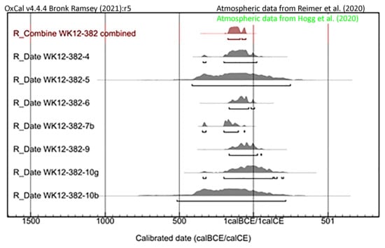 - Reimer, P.J.; Austin, W.E.; Bard, E.; Bayliss, A.; Blackwell, P.G.; Ramsey, C.B.; Butzin, M.; Cheng, H.; Edwards, R.L.; Friedrich, M. The IntCal20 Northern Hemisphere radiocarbon age calibration curve (0–55 cal kBP). Radiocarbon 2020, 62, 725–757. [Google Scholar] [CrossRef]