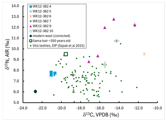 - Szpak, P.; Millaire, J.F.; White, C.D.; Donnan, C.B.; Longstaffe, F.J. Stable Isotope Sourcing of Wool from Textiles at Pacatnamu. Archaeometry 2018, 60, 612–627. [Google Scholar] [CrossRef]