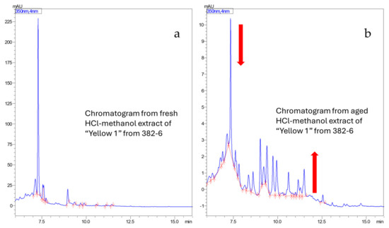 HPLC analyses were carried out on a Shimadzu LC-20AT pump paired with an SPD-M20A photodiode array detector. The flow rate was 1 mL/min and a 20-μL injection volume was used for both of the separation programs employed. The analytical column used was a Restek Ultra AQ C18 column from Phenomenex (25 cm × 4.6 mm and 5 μm particle size) with temperature control provided by a heat tape controlled with a variable AC transformer to maintain the column at 30 °C. For the oxalic acid–methanol and DMSO extracts, 0.1% (v/v) formic acid in deionized water (solvent A) and acetonitrile (ACN, HPLC grade) as solvent B served as mobile phases. The program for separation of these extracts was 90% B for 6 min, followed by a linear gradient to 10% B in 64 min, followed by 90% B in 0 min held for 10 min (total run time 80 min including re-equilibration). For the preparations in methanol/HCl (after Manhita et al. [103,104], the mobile phase consisted of acetonitrile (A) and 2.5% (v/v) aqueous acetonitrile with 0.5% (v/v) formic acid (B) in a gradient of 0–100% A from 0 to 10 min, 100% A from 10 to 15 min and a 5 min rinse of 100% solvent B between runs. UV-vis spectra were acquired in the range of 200–800 nm with a resolution of 4 nm. Data was processed using Shimadzu LabSolutions software.