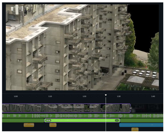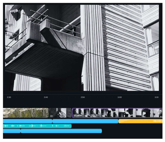 Figure 2. Detail of the textured concrete surface of McMahon Hall—capture from the combined video and audio material. The colored lines represent the tracks for the voices and sounds generated in ElevenLabs.