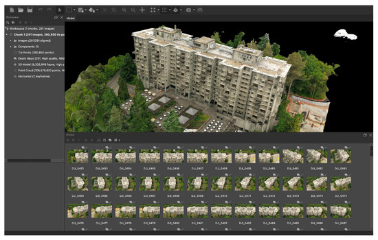 Figure 3. Generation of the 3D model of McMahon Hall in Agisoft Metashape Professional (v2.2).