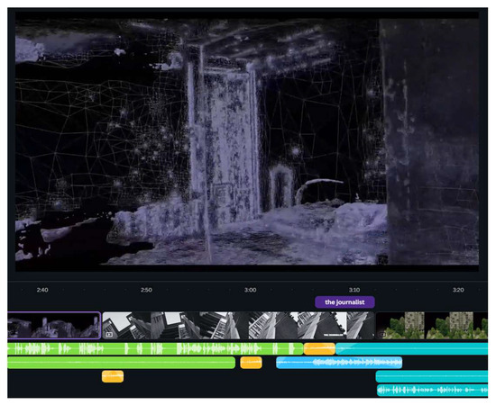 Figure 4. Triangulated 3D model of a residential unit—capture from the final combined video and audio material. The colored lines represent the tracks for the voices and sounds generated in ElevenLabs.