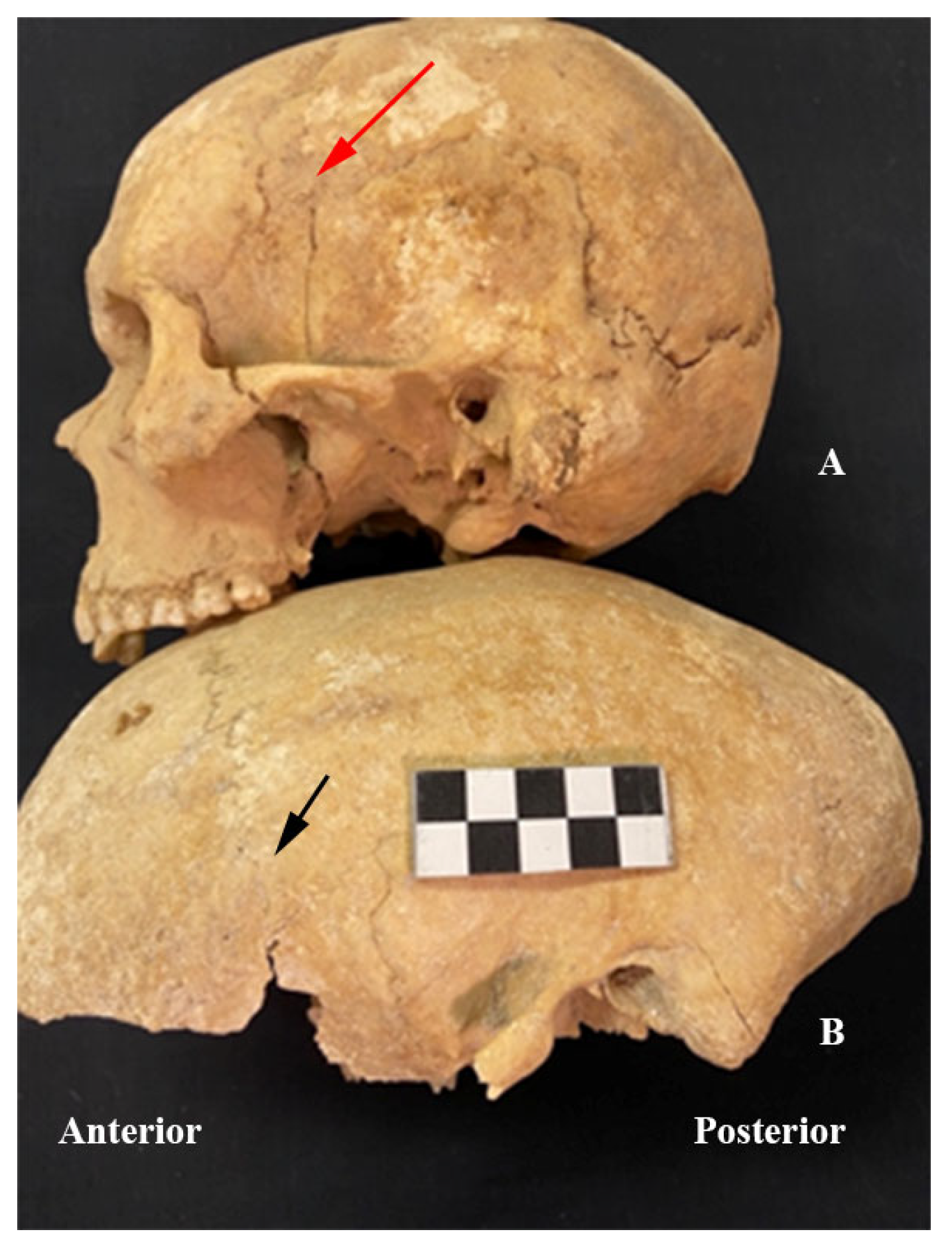 - Lloret, F.R.; Díaz, J.A.S.; de Togores-Muñoz, C.R.; Rodrigo, J.C.; Rodrigo, B.C.; Lloret, J.B.M. Paleopatología traumática en dos cráneos encontrados en el nivel III de la Cova d’En Pardo (Planes, Alicante). MARQ Arqueol. Mus. 2006, 1, 9–24. [Google Scholar]